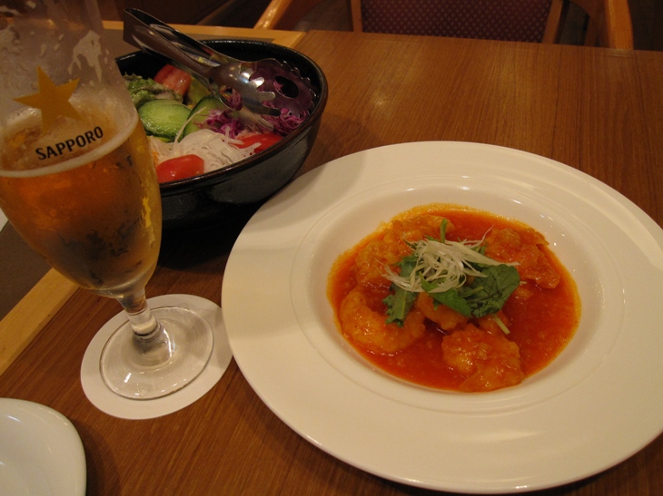 写真はエビチリとサラダだけど、一番おいしかったのは柔らかいローストビーフでした(^-^