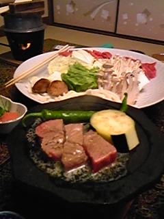 夕食は但馬牛ステーキ、しゃぶしゃぶ、刺身でお腹いっぱい(>_<)